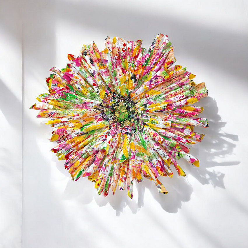 Erst kürzlich entstand eine neue Ausdrucksform im Schaffen von Sabeth Holland, die sie «Discdelights» nennt. Auf einer scheibenförmigen Fläche, lässt sie stark strukturierte Akzente räumlich hervortreten und setzt Glanzpunkte aus Gold und Sternenstaub zu fröhlichen visuellen Melodien zusammen. Für die raumgreifenden Wandskulpturen verwendet sie zur Formgestaltung Polyurethan.